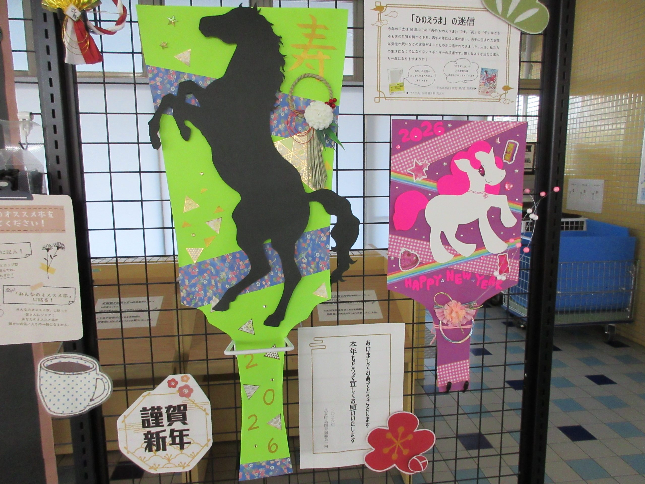 カウンター前では午年にちなんで、馬の出てくる絵本が書かれた「図書館おみくじ」(なくなり次第終了)も引くことができます。